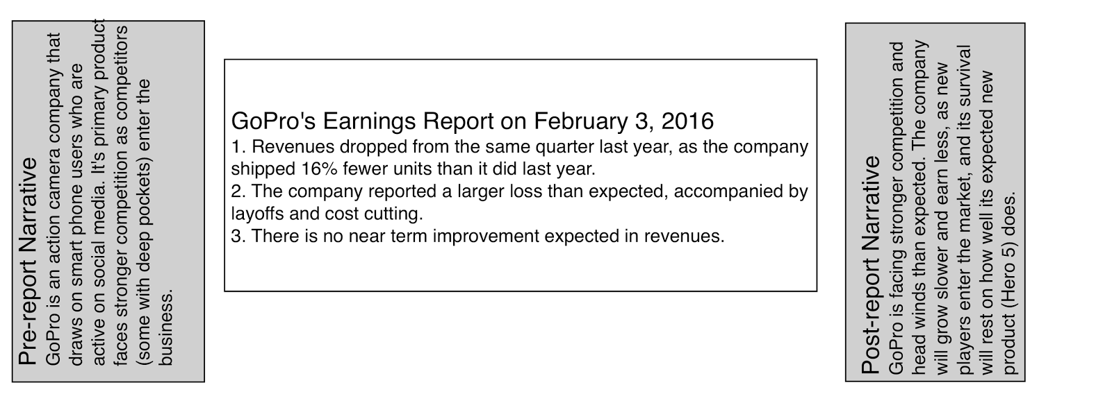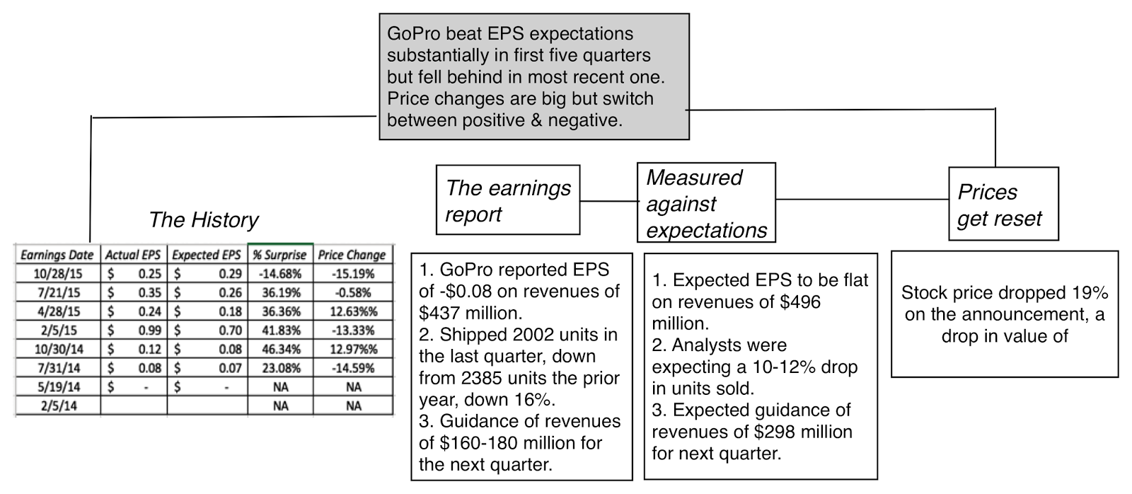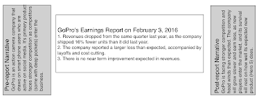 Unlike GoPro, where expectations and stock prices had been on their way down in the year before the most recent earnings report, the most recent earnings report was a surprise, though, at least at first sight, it did not include information that would have led to this abrupt a reassessment: