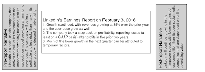 I have a sneaking suspicion that my biases did affect my inputs for both companies, making me more pessimistic in my GoPro inputs and more optimistic on my LinkedIn values. That said, the values that I obtained were not in keeping with my preconceptions. In spite of my inputs, GoPro is significantly under valued and in spite of my implicit attempts to pump it up, LinkedIn does not make my value cut. Put differently, the market reaction to the most recent earnings report at LinkedIn was clearly an over reaction, but it just moved the stock from extremely over valued, on my scale, to close to fair value.