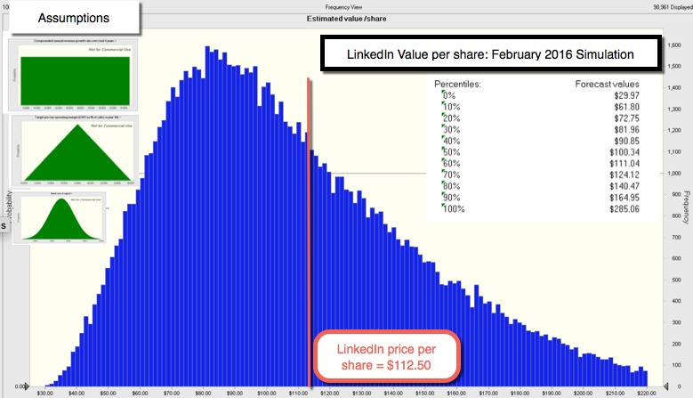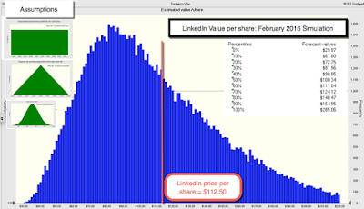 Allowing for Linkedin’s presence in two markets, I revalued the company with revenue growth of 25% a year for the next five years, leading to $15.3 billion in revenues in steady state (ten years from now), and a target pre-tax operating margin of 18%, lower than my target margins for Twitter or Facebook, reflecting the lower margins in the manpower business. The value per share that I get for the company is $103.49, about 10% below where the market is pricing the stock right now. The results of the simulation are presented below: