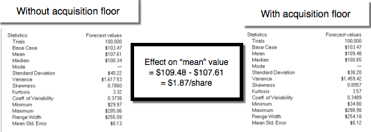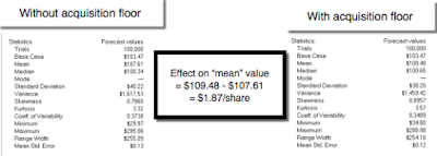 To evaluate the impact that introducing the possibility of an acquisition does to LinkedIn's value, I started by assuming that the acquisition price for LinkedIn would be $8 billion, but that the value would range from $4 billion (if revenue growth is flat and margins are low) to $12 billion (if revenue growth is robust). I then reran the simulation of LinkedIn's valuation, with the assumption that the company would be bought out, if the market capitalization dropped below the acquisition price. In the picture below, I compare the values across the two simulations, one without an acquisition floor and one with: