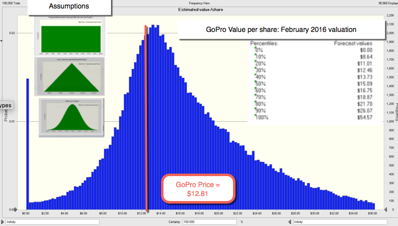 In my updated valuation, I reduced my targeted revenues to $4.7 billion in steady state, my target operating margin to 9.84% (the average for electronics companies) and increased the likelihood that the company will fail to 20%. The value per share that I get with my updated estimates is $17.66, 35% higher than the price per share of $12.81, at the start of trading on February 22, 2016. Looking at the simulation of values, here is what I get: