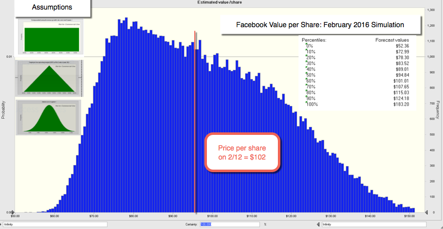 The value per share that I get for the company, with this narrative, is about $95/share, just a little bit under the $102/share that the stock was trading at in February 2016. As with my other valuations in this series, I ran a simulation of Facebook’s value and the results are below: