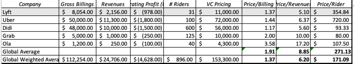 This approach yields a value for the equity of about $58.6 billion for Uber’s equity, which again depending on the share count would translate into a share price of $51/share. (Update: Based upon news stories today (4/26/19), it looks like the share count will be closer to 1.8 billion to 2 billion shares, which will result in a value per share closer to $30/share).