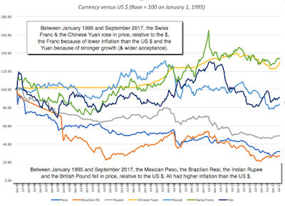 - Currency: A currency is a medium of exchange that you use to denominate cash flows and is a store of purchasing power, if you choose to not invest. Standing alone, currencies have no cash flows and cannot be valued, but they can be priced against other currencies. In the long term, currencies that are accepted more widely as a medium of exchange and that hold their purchasing power better over time should see their prices rise, relative to currencies that don't have those characteristics. In the short term, though, other forces including governments trying to manipulate exchange rates can dominate. Using a more conventional currency example, you can see this in a graph of the US $ against seven fiat currencies, where over the long term (1995-2017), you can see the Swiss Franc and the Chinese Yuan increasing in price, relative to the $, and the Mexican Peso, Brazilian Real, Indian Rupee and British Pound, dropping in price, again relative to the $.