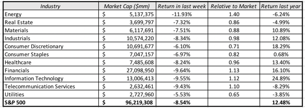 Returning the focus to the last week, let's first look across sectors to see which ones were punished the most and which ones endured. Using the S&P classification for sectors, here is how the sectors performed between February 2, 2018 and February 9, 2018;