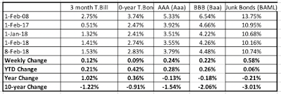 While equities have felt the bulk of the pain, it is interest rates that have been labeled as the source of this market meltdown, and the graph below captures the change in treasury rates and corporate bonds in different ratings classes (AAA, BBB and Junk) over the last week and the last year: