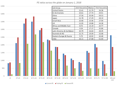 With these estimates, you should be okay with how the market is valuing equities at the close of trading February 8, 2018; it is slightly under valued at 3.90%. To provide a contrast, if you feel that analysts are over estimating the impact of the tax cuts and that the historical earnings growth rate over the last decade (about 3.03%) is a more appropriate forecast for future growth, holding the risk free rate and ERP at 3% and 5% respectively, the value you will get for the index is 2233, about 16% below the index level of February 8, 2018. If you want put in your own estimates of earnings growth, T.Bond rates and equity risk premiums, please download this spreadsheet. In fact, if you are inclined to share your estimates with a group, I have created a shared google spreadsheet for the S&P 500. Let's see what we can get as a crowd valuation.