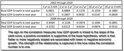 - It is the short end that has predictive power for the economy: Over the entire time period (1962-2018), the slope of the short end of the yield curve is positively related with economic growth, with more upward sloping yield curves connected to higher economic growth in subsequent time periods. The slope at the long end of the yield curve, including the widely used differential between the 10-year and 2-year rate not only is close to uncorrelated with economic growth (the correlation is very mildly negative).