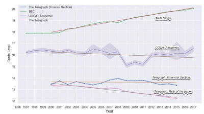 This is clearly anecdotal evidence, and may reflect company-specific factors, but there is evidence to indicate that Coca Cola is not alone in bulking up its SEC filings. In a research paper focused almost entirely on how 10-K disclosures have evolved over time, Dyers, Lang and Stice-Lawrence count not just the words in 10-K filings (one advantage of having electronic filings is that this gets easier), but also what they term redundant, boilerplate and sticky words (see descriptions below chart):