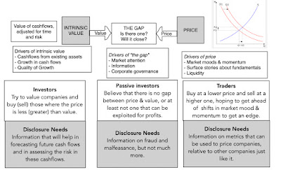 - Cater to your audience: Company disclose data to multiple groups, to governments to meet regulatory requirements and for taxes, to consumers about the goods and services they they sell, to their bankers about loan obligations due and to shareholders about their overeat financial performance. Rule writers on disclosure sometimes seem to forget that each of these groups need different information, and trying to meet all their needs in one disclosure is a disservice to all of them. It is worth remembering that the reason that we have 10-Ks and S-1s at companies is for shareholders, interested in investing in the company, not regulators, consumers, accountants or lawyers. That said, it is also worth remembering that not everyone investing in a company is an investor and that many are traders. Drawing on a contrast that I have used many times before, investors are interested in the value of a stock, which, in turn, is determined by cash flows, growth and risk, and buying stocks that they believe trade at a price less than the value. Traders, on the other hand, have little interested in fundamentals, focusing instead on mood and momentum, and how those forces can lead to prices increase.Much of the regulatory disclosure has been focused on what investors need to value companies, albeit often with an accounting bias. However, there are for more traders than investors in the market, and their information needs are often simpler and more basic than investors. Put simply, they want metrics that are uniformly estimated across companies and can be used in pricing, whether it be on revenues or earnings. With young companies, they may even prefer to use user or subscriber counts over any numbers on the financial statements.