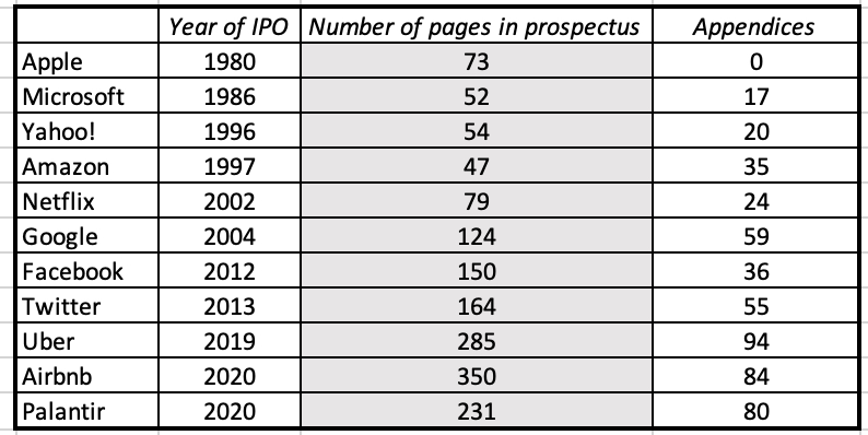 The S-1 is a prospectus filing that companies that plan to go public in the US have to make, and it plays multiple roles, a recording of the company’s financial history, a descriptor of its business models and risks and a planner for its offerings and proceeds. As with the 10-K, the requirements for the prospectus go back to the Securities Exchange Act of 1934, but the disclosure requirements have become more expansive over time. To provide a measure of how much the S-1 has bulked up over time, consider the table below, where I compare the number of pages in the prospectus filings of two high profile companies from each decade, from the 1980s to today: