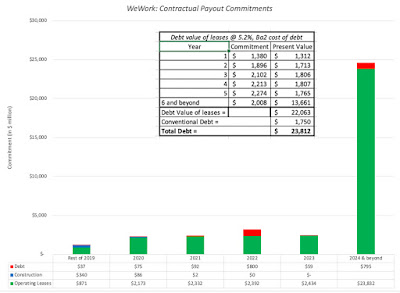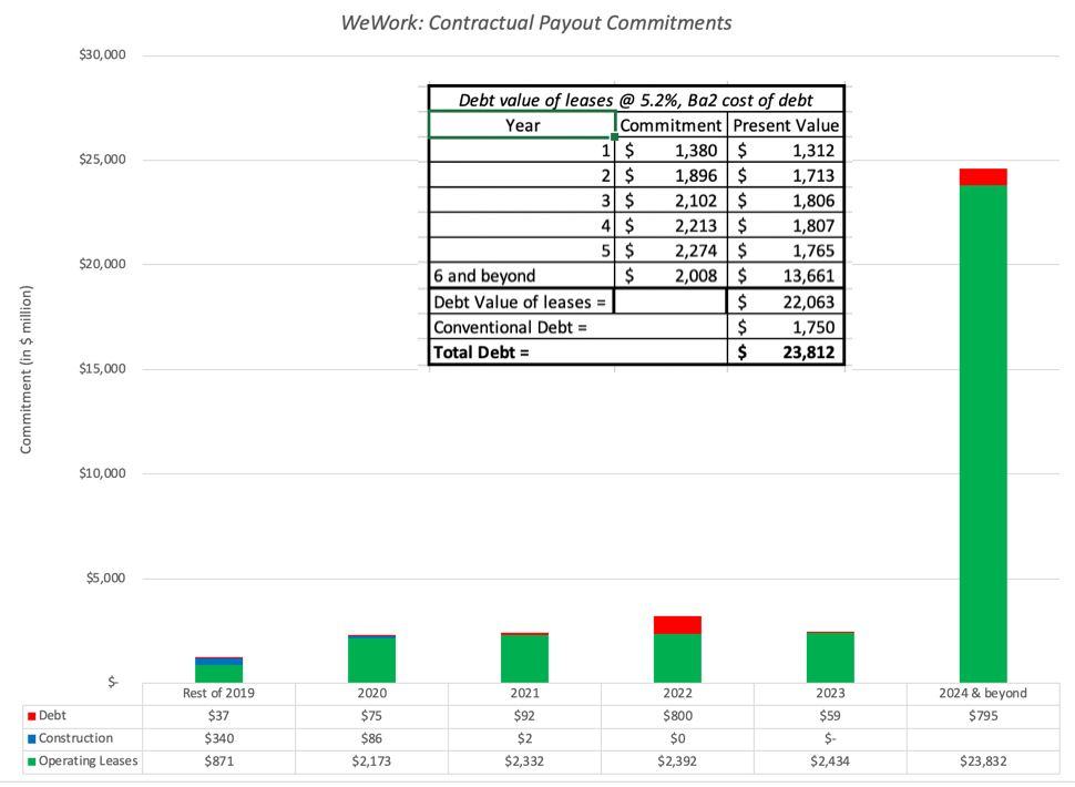 The WeWork business model is built on leasing properties, often for large amounts, with a long-period commitment, and not surprisingly, the results are manifested in lease commitments that represent a mountain of claims that the company has to cover before it can generate income for equity investors. The graph below captures the lease commitments that WeWork has contractually committed itself to for future years, and how much these commitments represent in equivalent debt: