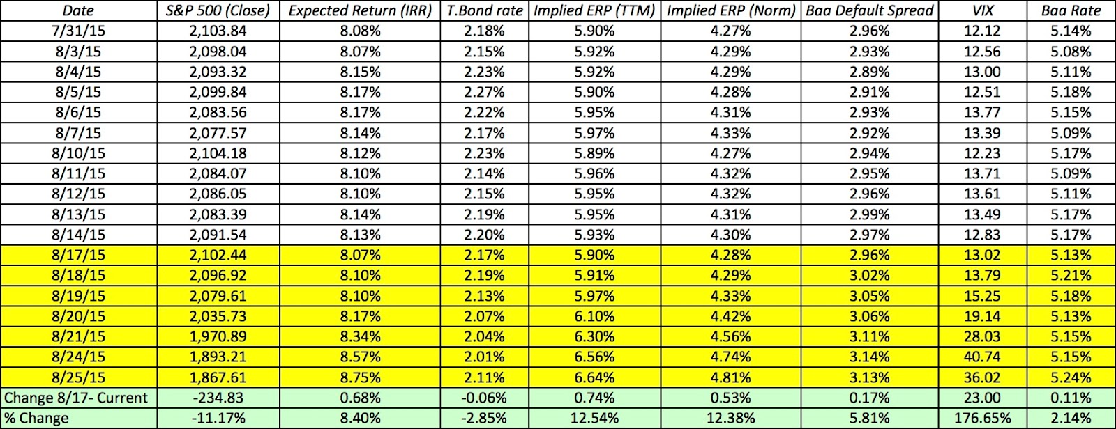 If you have been a reader of this blog, you know that my favorite device for disentangling the mysteries of the market is the implied equity risk premium, an estimate of the price that investors are demanding for the risk of investing in equities. I back this number out from the current market prices and expected future cash flows, an IRR for equities that is analogous to the yield to maturity on a bond:
