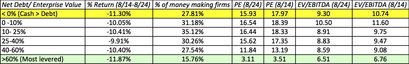 - Higher interest rates: The fear of the Fed has roiled markets for much of the last decade, and while it has played out as higher short term interest rates for the last two years, the ten-year bond rate, after a surge over 3% in 2018, is now back to 2.68%. There is the possibility that higher inflation and economic growth rate can push this number higher, but it is difficult to see how this would happen if recession fears pan out. In fact, as I noted in this post from earlier in the year, higher interest rates, if the trigger is higher real growth (and not higher inflation), could be a positive for stocks, not a negative.